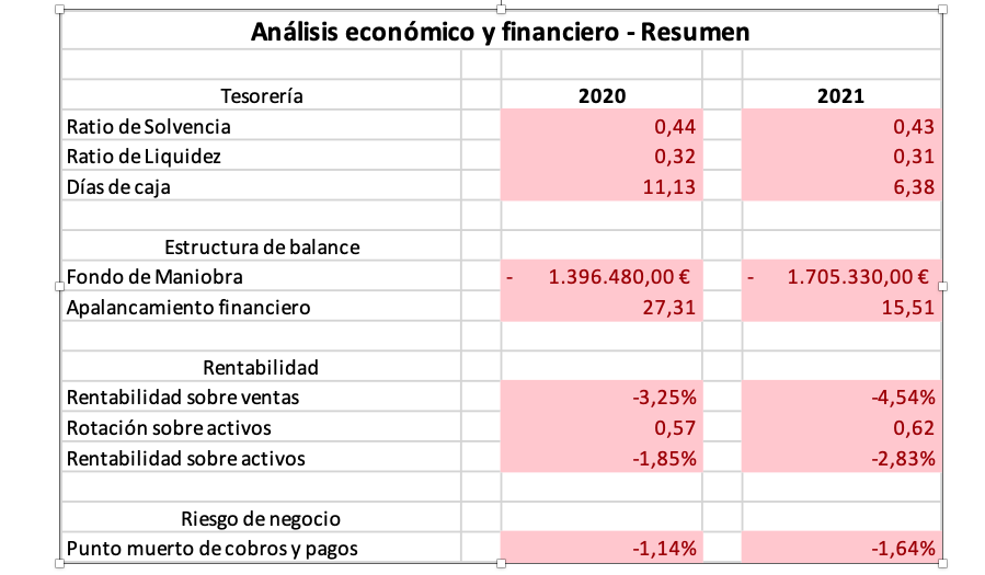 En definitiva, la empresa del ejemplo tiene tanto problemas de cuenta de resultados como de balance y dentro de éste se detectan problemas de activo (¿excesiva inversión en activos ociosos?) como de estructura de pasivo con muy poco capital y excesiva dependencia del endeudamiento a corto plazo.