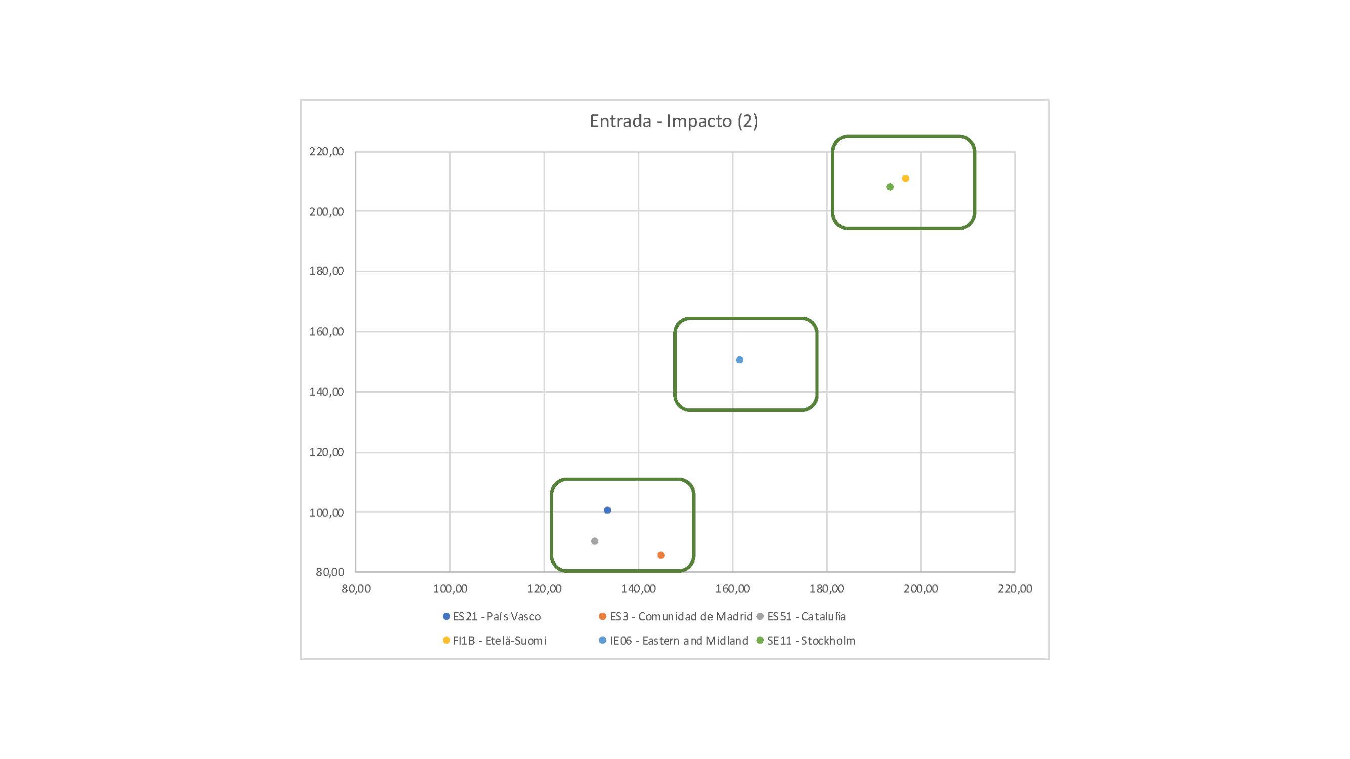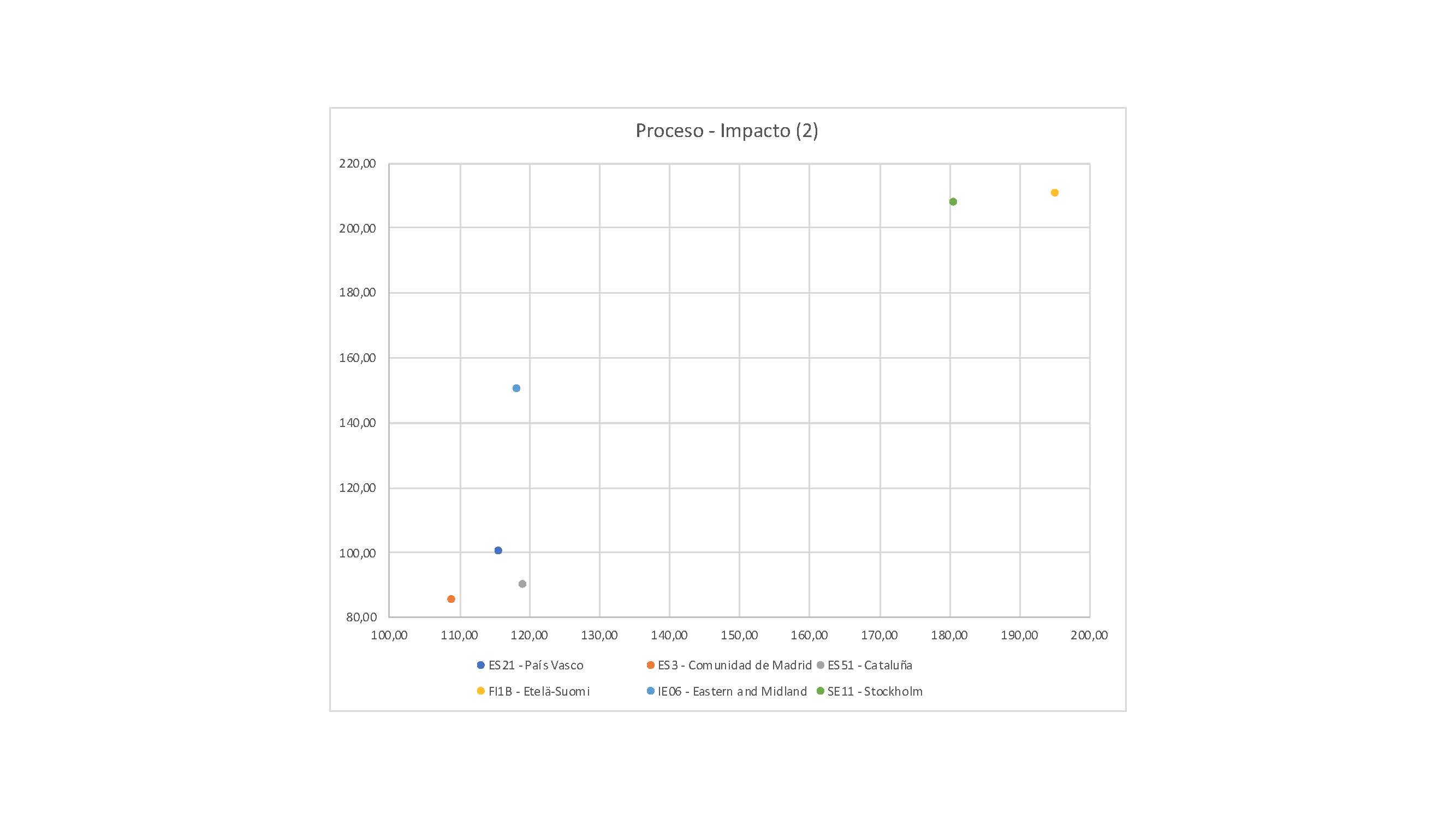 Proceso – Impacto (2): (Es importante anotar aquí que no tomo en consideración una pregunta trampa que distorsiona todo el índice: una empresa que introduce un producto nuevo para ella no hace innovación. Si la empresa X hace camisetas y dentro de un año, lanza una línea de calcetines; es evidente que X está lanzando un producto que no existía en su catálogo pero los calcetines hace años que se ofrecen en el mercado. Aquí no hay ninguna innovación.) ¿Qué nos dice este gráfico? Nos dice que el recorrido del motor de innovación de Euskadi (100,32) es muy superior al de Cataluña (89,95) y Madrid (85,07) aunque queda muy lejos de Dublín (149,98) y no digamos nada de Helsinki (210,34) y Estocolmo (207,80).
