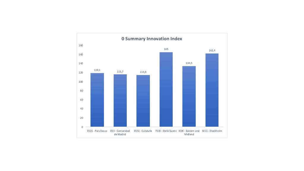 Para que la historia de lo que nos cuentan los indicadores se entienda mejor, he comparado Euskadi con otras regiones «Innovadores fuertes» y con dos «Innovadores líderes». Los «innovadores fuertes» son: Madrid, Cataluña y la región de Dublín. Los «innovadores líderes» son las regiones de Helsinki y de Estocolmo, siendo Helsinki, si no me equivoco, la región líder en innovación de Europa.